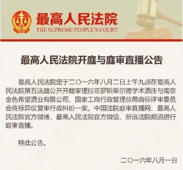 2016年8月1日最高法院通过其官方微博发布公告,公布了2016年8月2日将对“拉菲庄园”案开庭与庭审直播的消息。8月2日当日,庭审通过中国法院庭审直播网、最高法院官方微博、最高法院官方微信、新浪法院频道进行了全程直播,庭审持续了5个多小时。